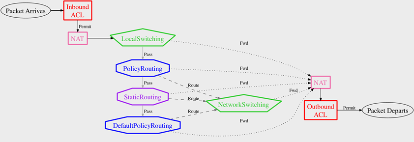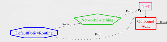 Let’s sketch out the topology expression for a subset of the IOS stages. In particular, let’s take the portion consisting of DefaultPolicyRouting, NetworkSwitching, outbound NAT, and outbound packet filtering (ACL):