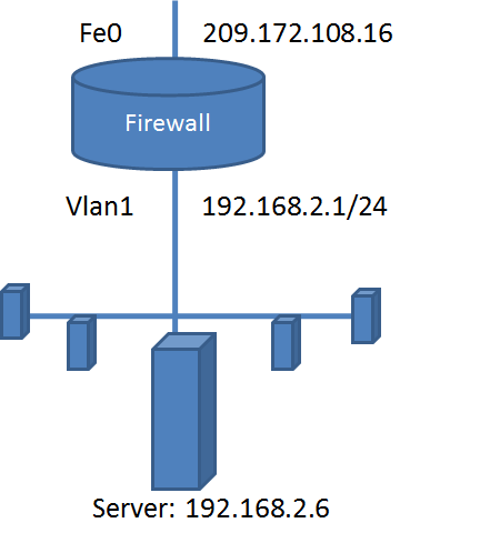 Let’s start with a sample IOS configuration (we’ve added the line numbers for reference) . The following diagram shows the architecture: the system has a firewall with two named interfaces, with the external interface connected to a server:
